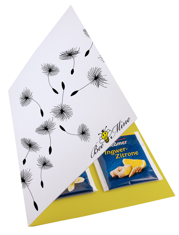 Klappkarte im DinA5 Format mit 4 Meßmer Teebeuteln geklebt an der Innenseite/-n der Karte. Die Werbung drucken wir auf allen Seiten der Klappkarte. Unter "Anhänge" können Sie alle Teesorten herunterladen. Beim Bestellvorgang, geben Sie unter "Kommentare" die gewünschte bzw. gewünschten Tessorte/n ein.