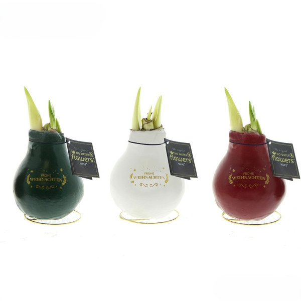 Alle No Water Flowers® sind mit einem Metallständer ausgestattet, sodass die gewachste Amaryllis immer stabil steht. Die Original No Water Flowers® erkennt man leicht am Etikett, das an der Zwiebel befestigt ist. Diese Amarylliszwiebeln benötigen keinerlei Pflege. Stellen Sie die gewachste Amaryllis an einen hellen Ort, jedoch nicht in direktes Sonnenlicht, und genießen Sie die prächtigen Blüten, die sich innerhalb von 3 bis 5 Wochen entfalten. Blumenzwiebeln sind Naturprodukte, jede ist einzigartig in Form und Aussehen.