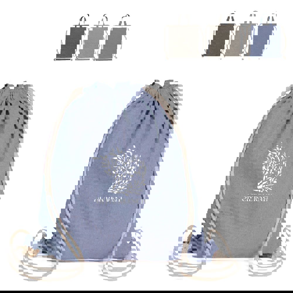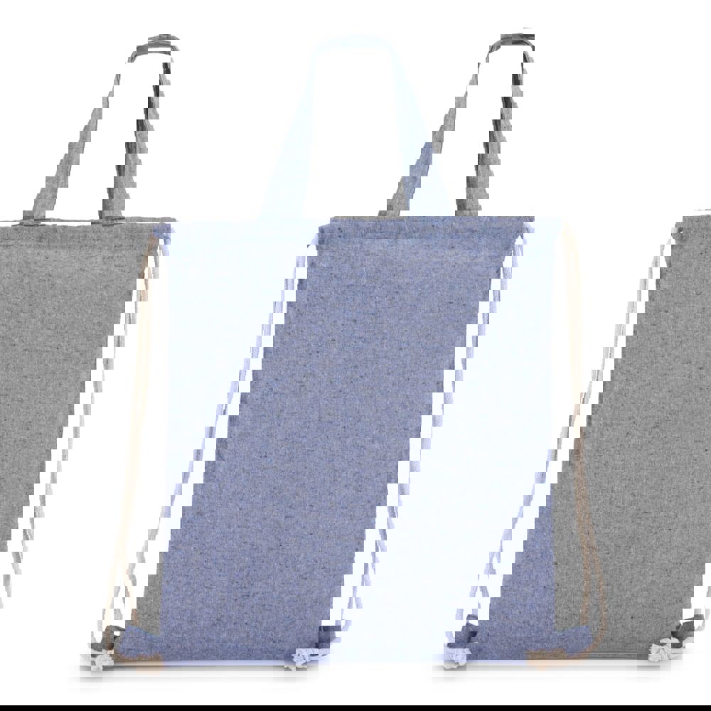 Praktischer Kordelzugbeutel mit Tragegriffen aus recycelter Baumwolle. Die recycelte Baumwolle, die von unterschiedlicher Herkunft ist, verleiht dem Stoff eine einzigartige Optik und Haptik. Die unvermeidlichen Farbabweichungen sind ein Zeichen für den Recycling-Charakter dieser Tasche.
