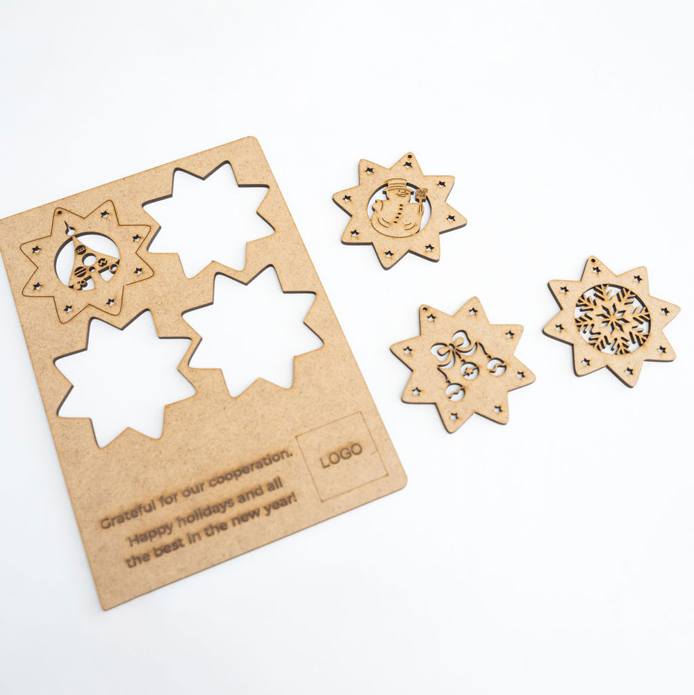 Wooden Wish – Holz-Weihnachtskarte mit Dekorationen, Puzzle, Figur, recyceltes MDF