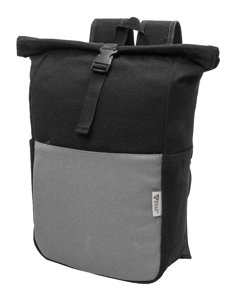 Rolltop-Rucksack aus recyceltem Canvas mit Schnallenverschluss und Reißverschluss-Fronttasche aus weichem recyceltem PU-Leder. Mit gepolstertem Laptopfach (15 Zoll), Seitentaschen, gepolstertem Rücken und Schultergurten. Material: 70 % recycelte Baumwolle und 30 % RPET-Polyester. Mit Labele recycelte Baumwolle.