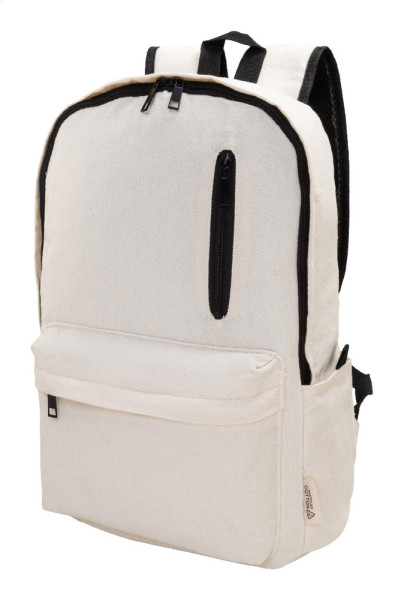 Rucksack aus recyceltem Canvas mit Reißverschluss-Hauptfach, gepolstertem Laptopfach (15"), 2 vorderen Reißverschlusstaschen, Seitentaschen, Trolley-Gurt sowie gepolsterten Rücken- und Schultergurten. Hergestellt aus 70 % recycelter Baumwolle und 30 % RPET-Polyester. Mit Label recycelte Baumwolle.