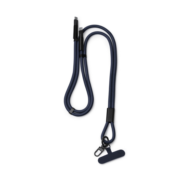 Landyard aus recyceltem Nylon mit Smartphone-Halterfunktion und Typ-C-Anschlusskabel an beiden Enden. Das Kabel dient sowohl zum Aufladen als auch zur Datenübertragungsverbindung. Mit einem kleinen Karabiner an einem Ende zum Tragen anderer Gegenstände.
