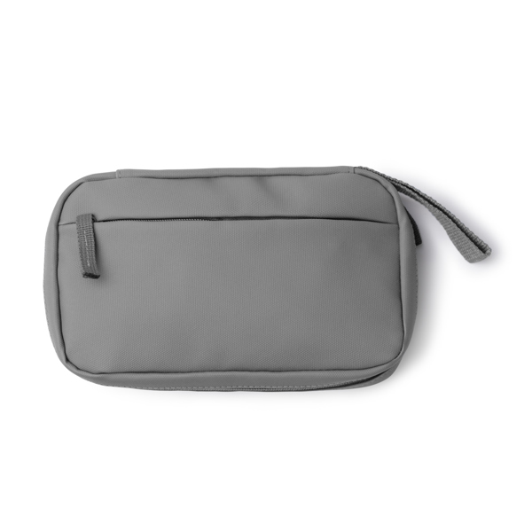 Kulturbeutel aus Polyurethan mit Reißverschluss zum vollständigen Öffnen. Es hat zwei innere Mesh-Fächer: eines mit Reißverschluss und das andere in kleinere Taschen unterteilt. Inklusive Vordertasche mit Reißverschluss. Die Reißverschluss- und die Trageriemenpassen farblich zur Tasche.