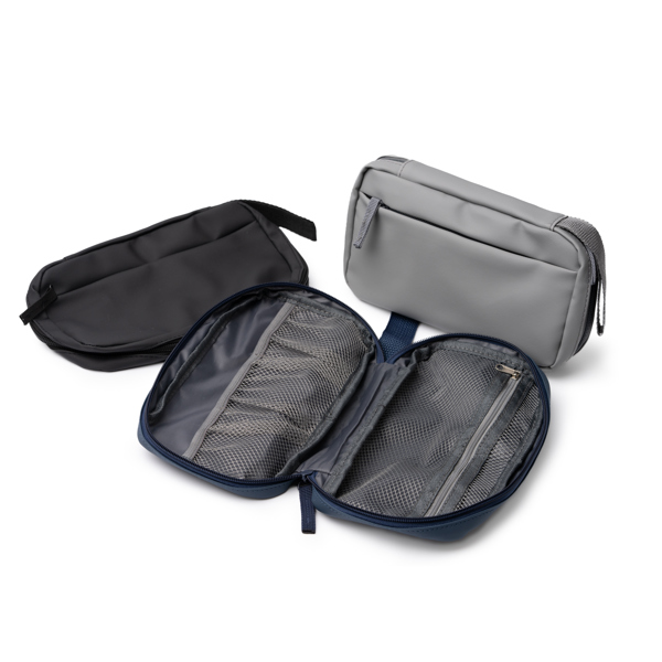 Kulturbeutel aus Polyurethan mit Reißverschluss zum vollständigen Öffnen. Es hat zwei innere Mesh-Fächer: eines mit Reißverschluss und das andere in kleinere Taschen unterteilt. Inklusive Vordertasche mit Reißverschluss. Die Reißverschluss- und die Trageriemenpassen farblich zur Tasche.