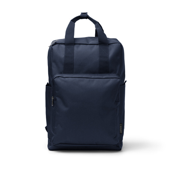 Rucksack aus recyceltem 600D-Polyester mit Hauptfach. Im Inneren befindet sich eine Tasche für die Beförderung von Laptops bis zu einer Größe von 16 Zoll. Außen verfügt sie über ein Vorderfach mit Reißverschluss, zwei Tragegriffe an der Oberseite und gepolsterte Schultergurte und Rückenteil.