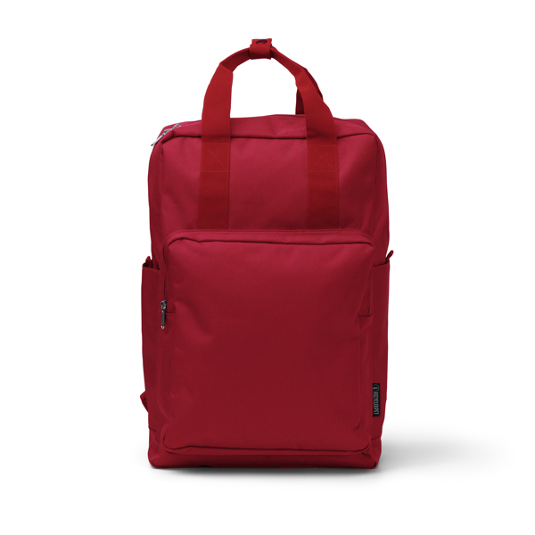 Rucksack aus recyceltem 600D-Polyester mit Hauptfach. Im Inneren befindet sich eine Tasche für die Beförderung von Laptops bis zu einer Größe von 16 Zoll. Außen verfügt sie über ein Vorderfach mit Reißverschluss, zwei Tragegriffe an der Oberseite und gepolsterte Schultergurte und Rückenteil.