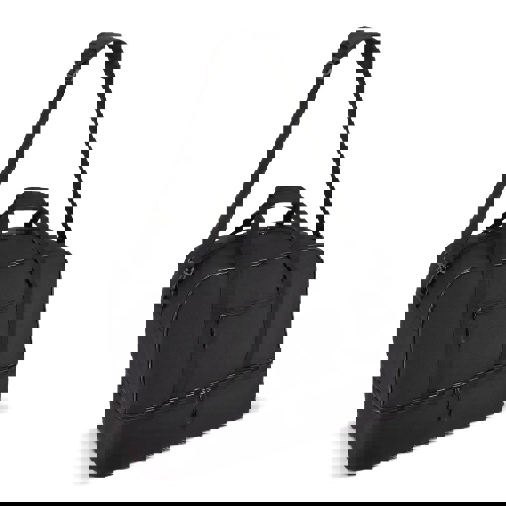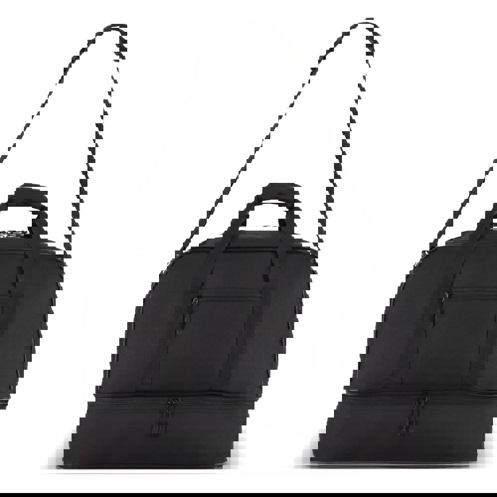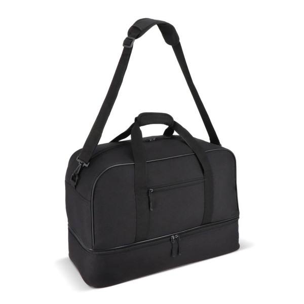 Reise- oder Sporttasche mit zwei Fächern aus recyceltem 600D-Polyester. Mit Griffen, abnehmbarer Schultergurt, Frontfach mit Reißverschluss und stabiler Bodenplatte. Die zwei Fächer trennen nasse/verschmutzte Kleidung oder Handtücher nach dem Training bzw. Schuhe von der Kleidung auf Reisen.