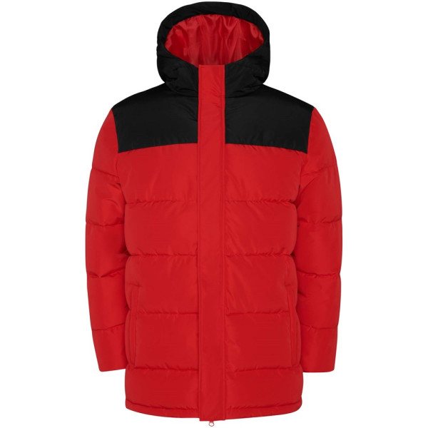 Wattierte Jacke mit fester Kapuze. Reißverschluss auf der Vorderseite, verdeckt durch eine Knopfleiste. Kinnschutz. Zwei Seitentaschen mit Reißverschluss. Elastische Bündchen.