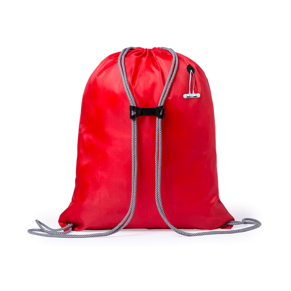 Rucksack mit Kordelzug aus weichem 190T Polyester in lebendigen Farben. Mit Kopfhörerausgang, extra dicken Zugbändern in Grau mit Stopper sowie Ecken mit Metallösen und Verstärkung.
