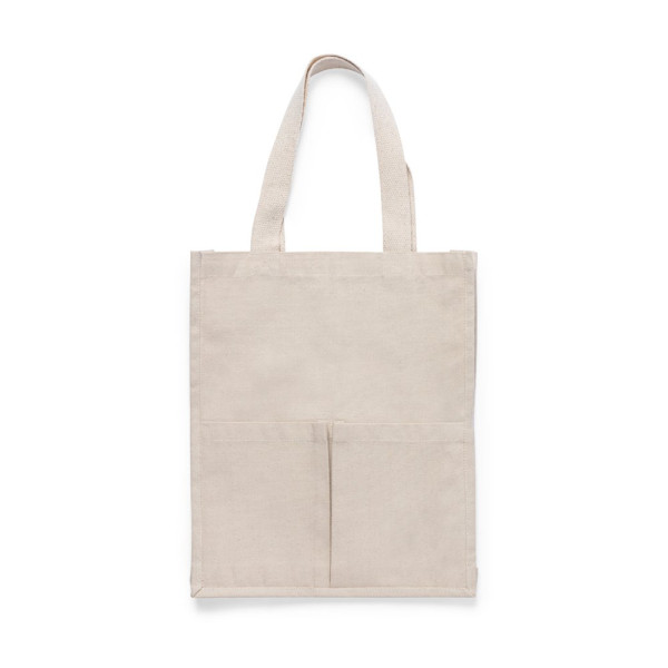 Tasche aus Baumwolle, natürliches Finish und Extragewicht von 310g/m2. Mit zwei Außentaschen, genäht und mit Zwickel. Extra breite und verstärkte mittlere Griffe (58 x 3,5 cm). Widerstandsfähig bis zu 10 kg Gewicht.