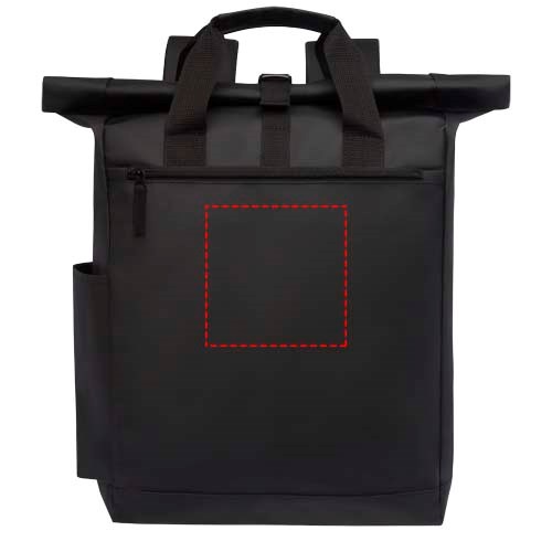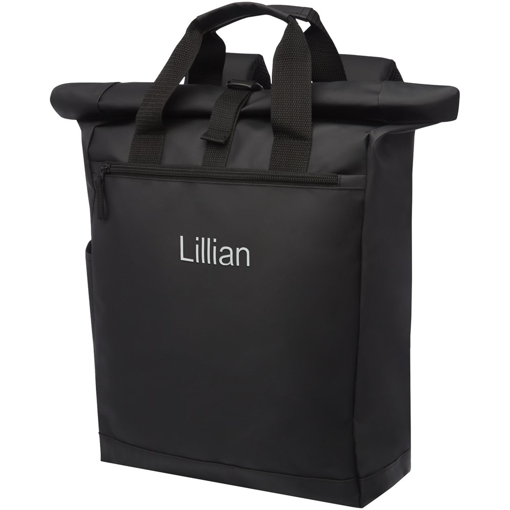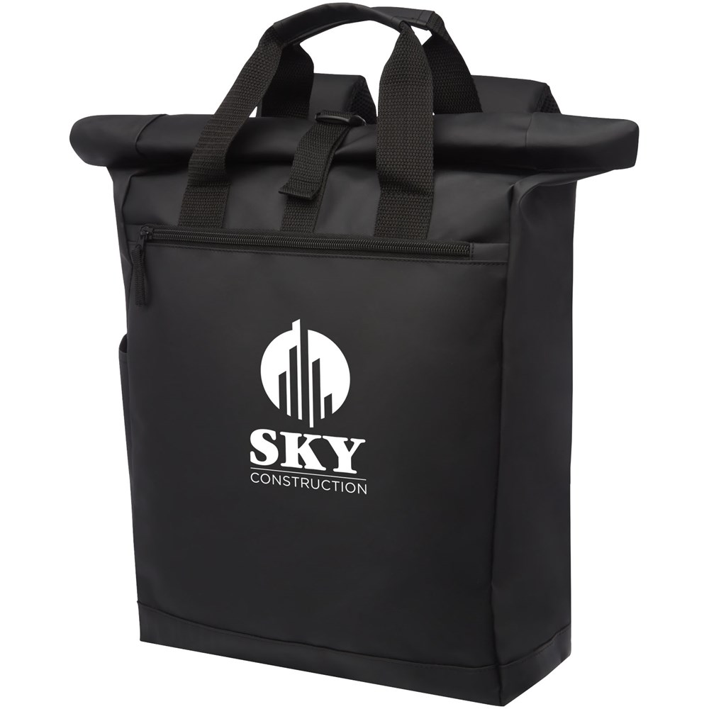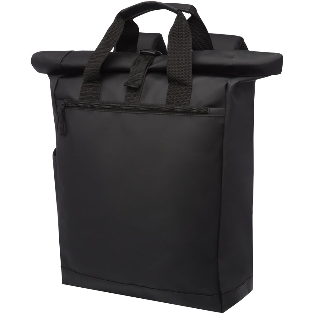Wasserabweisender Rucksack mit gepolstertem Laptopfach, gepolsterten verstellbaren Schultergurten, Hauptfach mit Reißverschluss und Rollverschluss sowie zwei Tragegriffen.