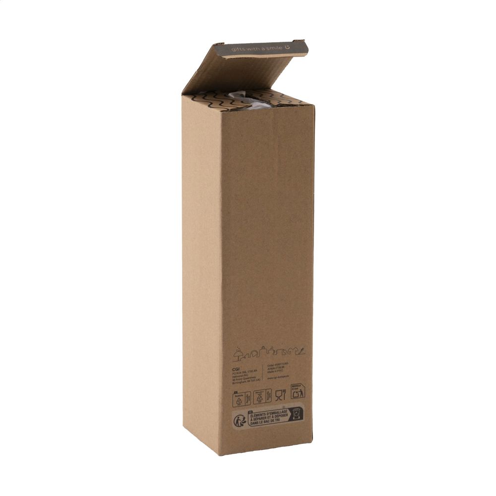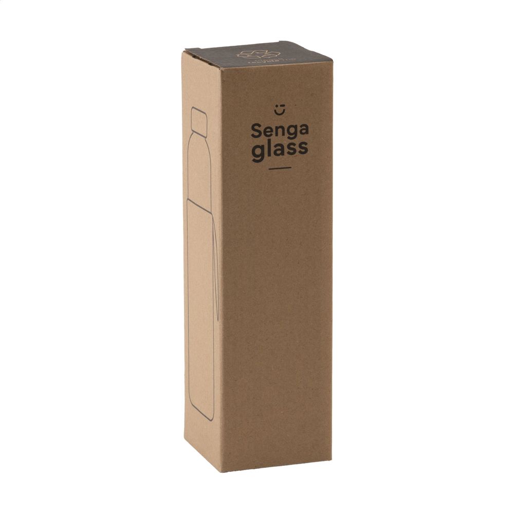 Schlanke, auslaufsichere Wasserflasche aus Kalknatronglas mit Edelstahl-Schraubverschluss. Mit Neoprenhülle zum bequemen Tragen der Flasche. Die Glasflasche ist mit Ausnahme des Schraubverschlusses spülmaschinenfest. Fassungsvermögen 750 ml. Verpackt pro Stück.