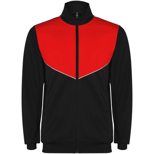 Trainingsanzug aus leichtem und elastischem Stoff. Jacke mit farblich abgesetzten Nähten im Brustbereich. Hoher Kragen mit Kontrastnähten. Zentraler Frontreißverschluss. Seitentaschen. 2x2-Rippenbündchen an Ärmeln und Bund. Hose mit elastischem Bund und Kordelzug. Seitliche Kontrasteinsätze mit Steppnaht. Beinsaum mit Reißverschluss.