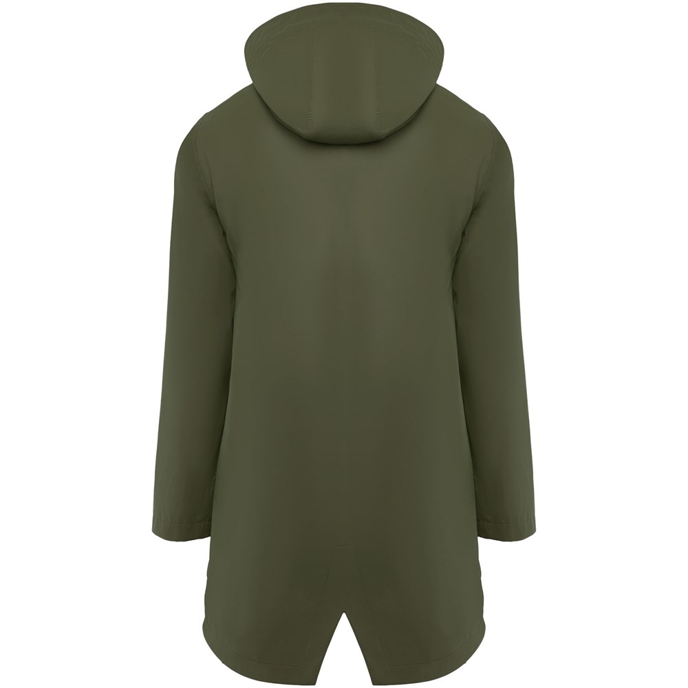 Wasserdichter Regenmantel. Kapuze mit Schirm. Hitzeversiegelte Reißverschlüsse und Nähte. Kontrastierende Details in Schwarz. Zwei Seitentaschen mit Reißverschluss. Schlitz am hinteren Saum. Abnehmbares Etikett. Wasserdicht. Das Modell ist 179 cm groß und trägt Größe S.