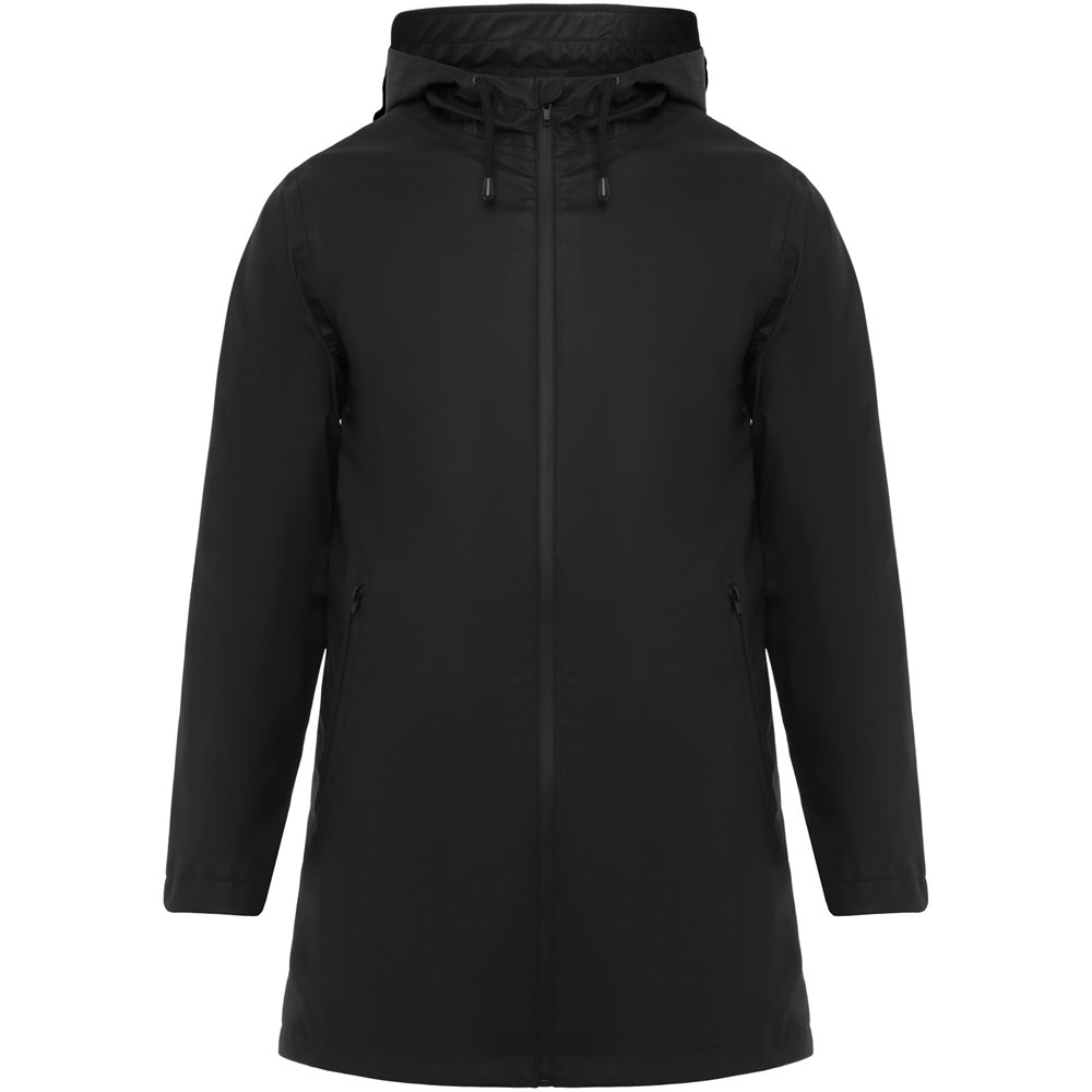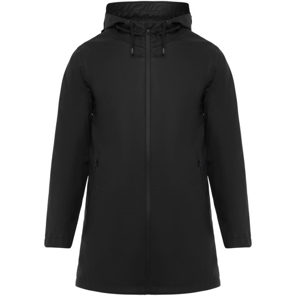 Wasserdichter Regenmantel. Kapuze mit Visier. Hitzeversiegelte Reißverschlüsse und Nähte. Kontrastierende Details in Schwarz. Zwei Seitentaschen mit Reißverschluss. Schlitz am hinteren Saum. Herausnehmbares Etikett. Wasserdicht. Das Modell ist 185 cm groß und trägt Größe M.