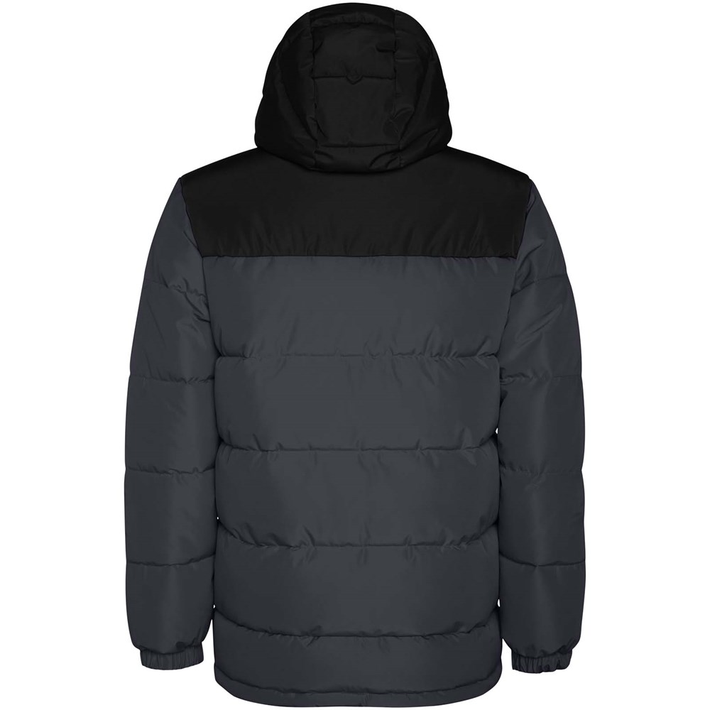 Wattierte Jacke mit fester Kapuze. Reißverschluss auf der Vorderseite, verdeckt durch eine Knopfleiste. Kinnschutz. Zwei Seitentaschen mit Reißverschluss. Elastische Bündchen.