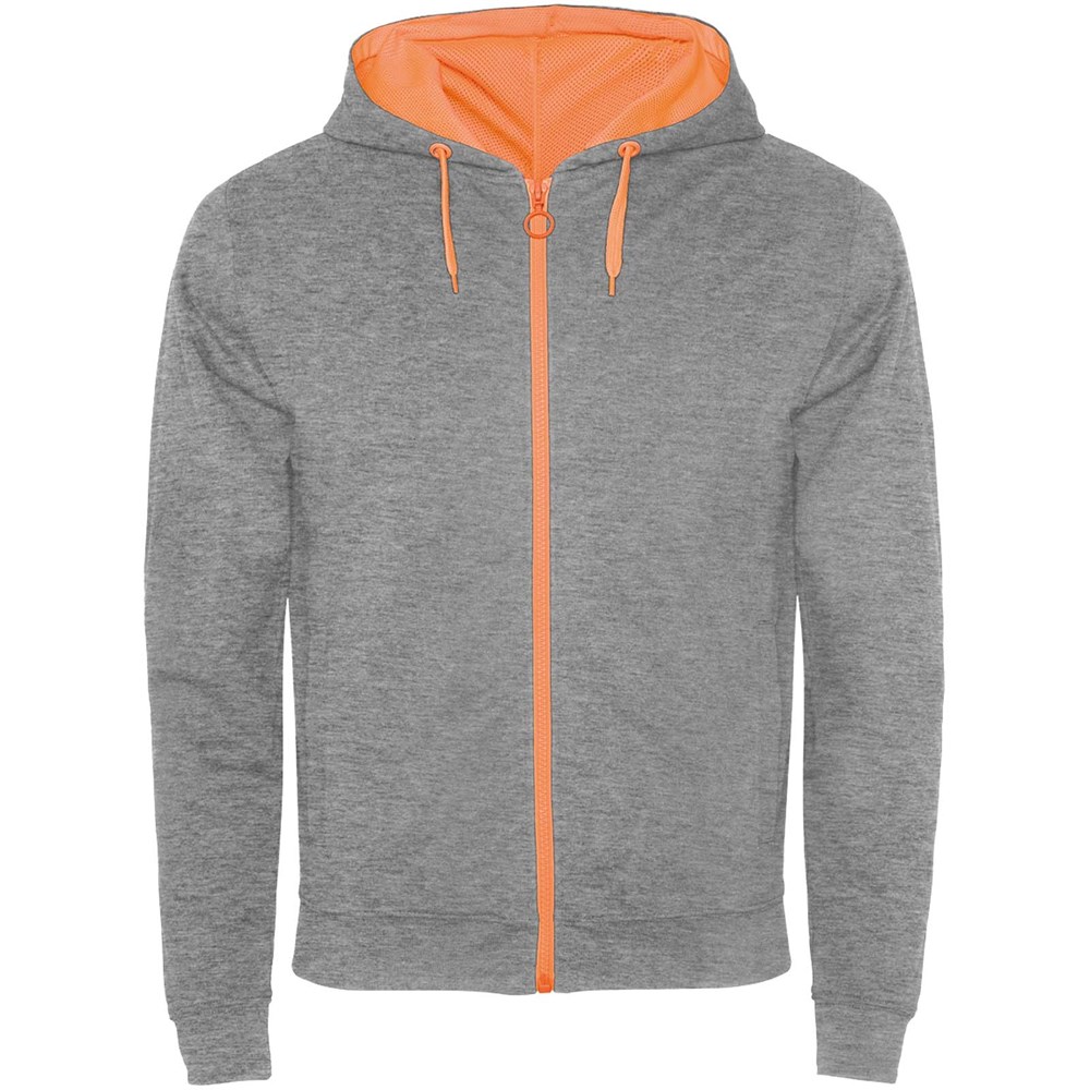 Sweatjacke aus ungebürstetem Fleece mit fluoreszierenden Verzierungen. Reißverschluss in der Mitte mit Zipper in Kontrastfarbe. Kapuze mit Innenfutter aus mikroperforiertem Polyesterstoff in fluoreszierender Kontrastfarbe. Kordelzug und Metallösen in fluoreszierender Kontrastfarbe. 1×1-Rippstrick an Bündchen und Taille. Zwei Taschen auf der Vorderseite mit breitem Saum. Verstärkte und verdeckte Nähte am Innenkragen. Abnehmbares Etikett.