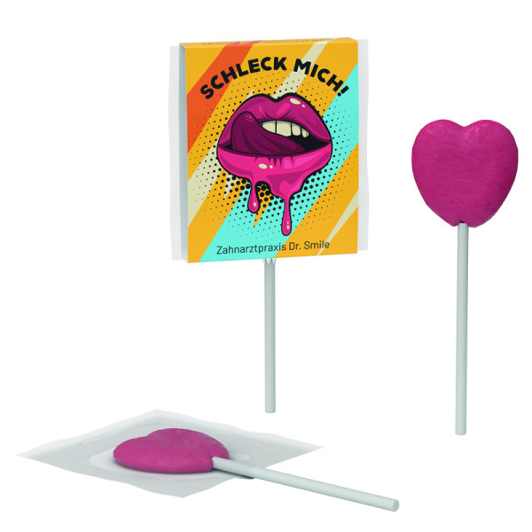 Flacher Lolly in Herzform in einer Werbeverpackung aus Karton mit einer Herz-Stanzung, Verpackung individuell bedruckt. Inhalt: 1 Lolly in Herzform, Kischgeschmack, 10 g Kartons à 120 Stück, 6 Kartons im Umkarton