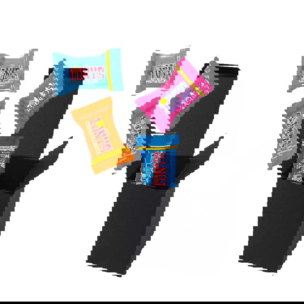 4 Tiny Tony´s verpackt in ColorBox Weiß. • Quadratisch, flexibel und nachhaltig: die ColorBox ist ein Naturprodukt "MADE IN GERMANY" welches aus 100% Recyclingpapier hergestellt wird,gefüllt mit 4 Tiny Tony's, das sind Mini‑Schokoladentäfelchen in unterschiedlichen Sorten: Milch, Milch Karamell Meersalz, Milch Nougat, Milch Haselnuss, Zartbitter Mandel Meersalz, Dunkle Milch, Dunkle Milch Brezel, Dunkle Milch Brezel, Weiße Schokolade und Weiße Schokolade Himbeere Knusper (Sortierung kann von der Abbildung abweichen). Die ColorBox kann auf Wunsch mit einem 4c Aufkleber oder 1c Druck individualisiert werden, weitere mögliche Werbeanbringungen sind eine Banderole 4c um die Box herum und ab 3000 Stück ein All-Over Druck 4c.