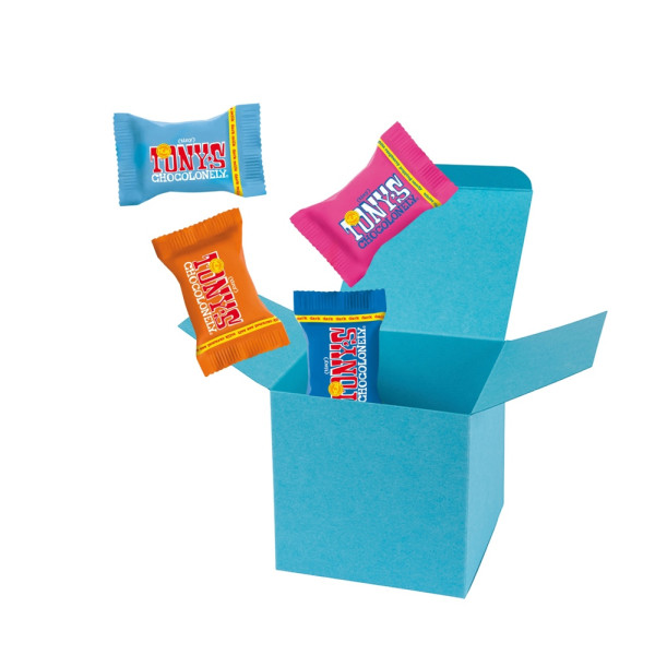 4 Tiny Tony´s verpackt in ColorBox Weiß. • Quadratisch, flexibel und nachhaltig: die ColorBox ist ein Naturprodukt "MADE IN GERMANY" welches aus 100% Recyclingpapier hergestellt wird,gefüllt mit 4 Tiny Tony's, das sind Mini‑Schokoladentäfelchen in unterschiedlichen Sorten: Milch, Milch Karamell Meersalz, Milch Nougat, Milch Haselnuss, Zartbitter Mandel Meersalz, Dunkle Milch, Dunkle Milch Brezel, Dunkle Milch Brezel, Weiße Schokolade und Weiße Schokolade Himbeere Knusper (Sortierung kann von der Abbildung abweichen). Die ColorBox kann auf Wunsch mit einem 4c Aufkleber oder 1c Druck individualisiert werden, weitere mögliche Werbeanbringungen sind eine Banderole 4c um die Box herum und ab 3000 Stück ein All-Over Druck 4c.