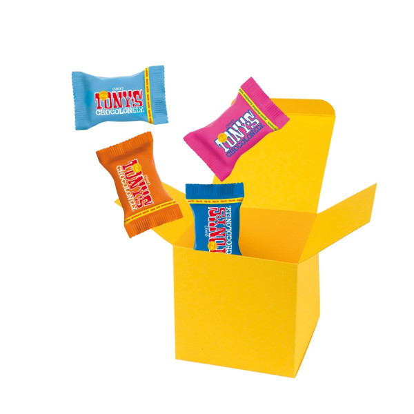 4 Tiny Tony´s verpackt in ColorBox Weiß. • Quadratisch, flexibel und nachhaltig: die ColorBox ist ein Naturprodukt "MADE IN GERMANY" welches aus 100% Recyclingpapier hergestellt wird,gefüllt mit 4 Tiny Tony's, das sind Mini‑Schokoladentäfelchen in unterschiedlichen Sorten: Milch, Milch Karamell Meersalz, Milch Nougat, Milch Haselnuss, Zartbitter Mandel Meersalz, Dunkle Milch, Dunkle Milch Brezel, Dunkle Milch Brezel, Weiße Schokolade und Weiße Schokolade Himbeere Knusper (Sortierung kann von der Abbildung abweichen). Die ColorBox kann auf Wunsch mit einem 4c Aufkleber oder 1c Druck individualisiert werden, weitere mögliche Werbeanbringungen sind eine Banderole 4c um die Box herum und ab 3000 Stück ein All-Over Druck 4c.