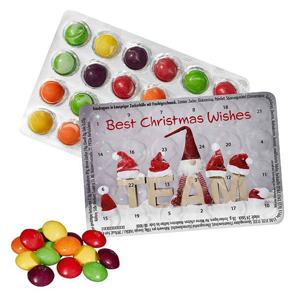 Blister-Adventskalender mit Aromaschutz, Deckfolie silberfarben mit Metalliceffekt. Änderungen des Standardmotivs, sowie Personalisierung nicht möglich!