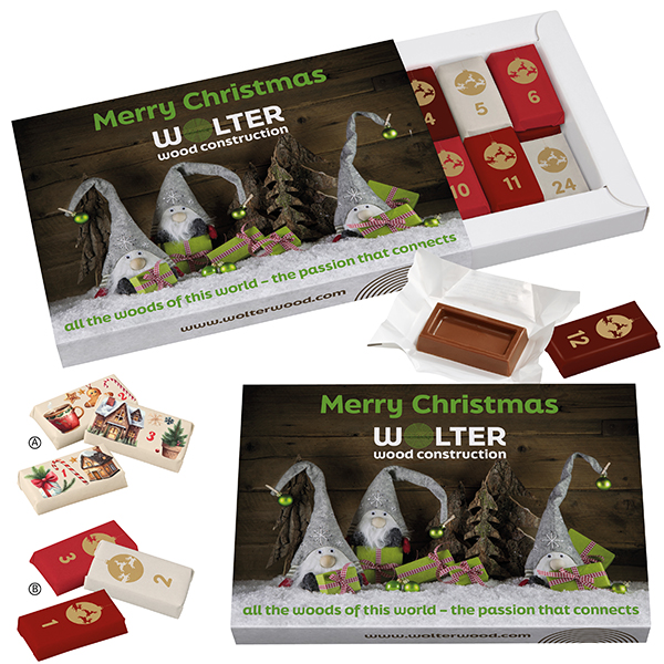 Hochwertige individuell gestaltbare Papier-Adventskalenderbox befüllt mit 24 in Papier eingeschlagenen und nummerierten Schokoladen-Naps mit Standardmotiv A) oder B), aus Premium-Vollmilchschokolade mit mindestens 35 % Kakao. Erst naschen & genießen und danach komplett über die Papiertonne recyclen.