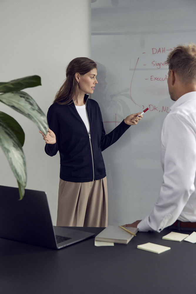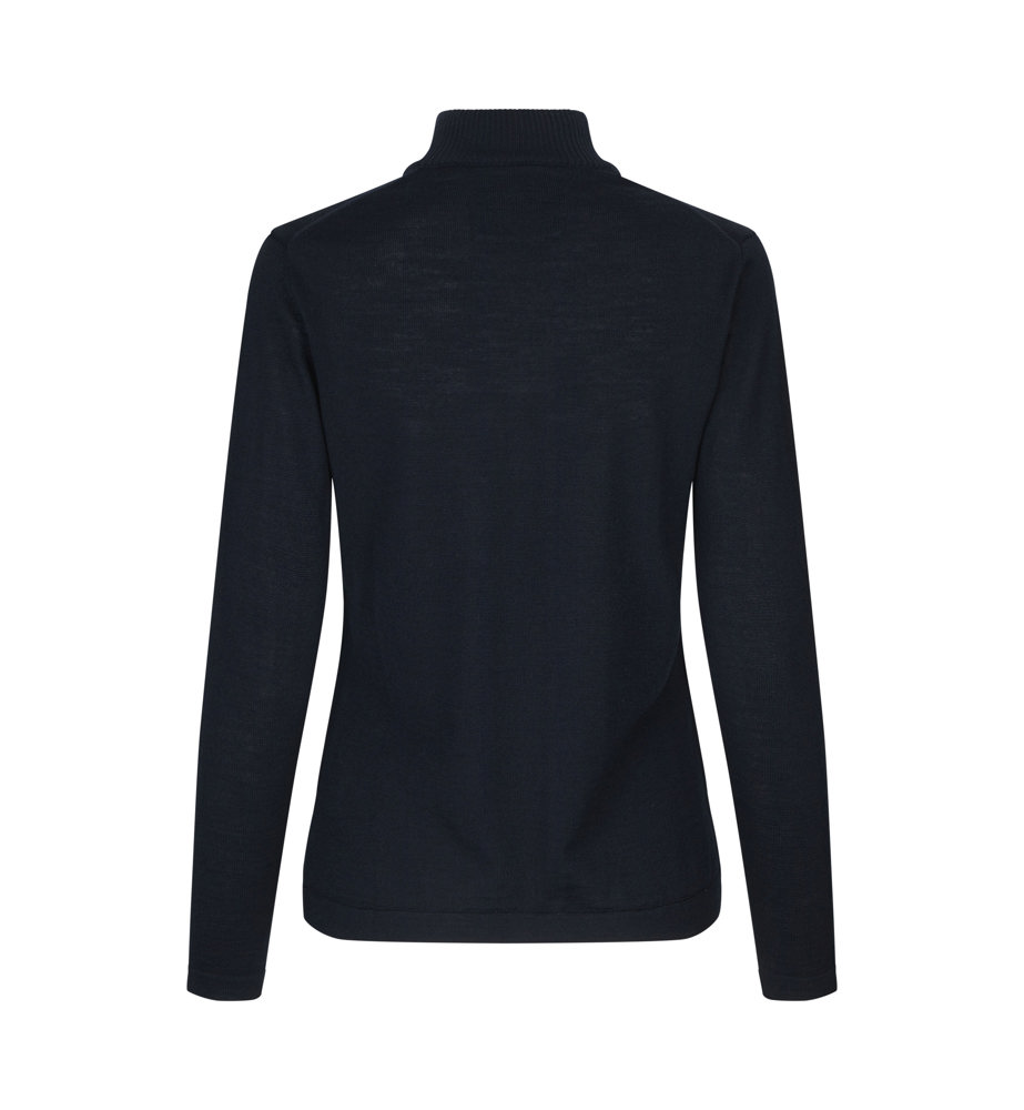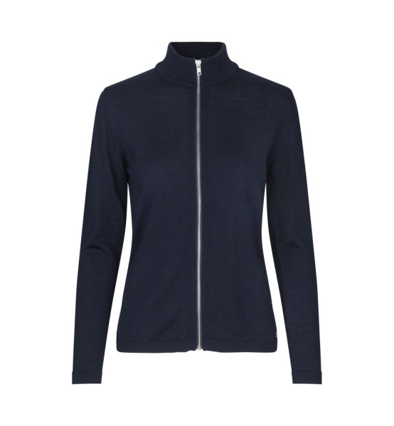 Elegante Damen-Strickjacke mit Reißverschluss und hohem Kragen aus weicher, mulesingfreier Merinowolle. Schicke Details am Kragen und an den Schultern für einen klassischen und zeitlosen Look. Perfekt til Arbeit og Freizeit. Sollte im Wollprogramm der Waschmaschine gewaschen werden – nach dem Waschen leicht in Form ziehen.