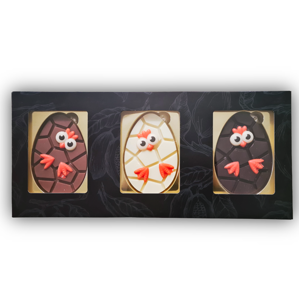 Frohe Ostern gewünscht? Dieses Osterei-Trio mit fröhlichem Küken-Motiv zaubert jedem ein Lächeln ins Gesicht. Drei köstliche Ostereier aus Milchschokolade, Weißschokolade und Zartbitter – alle versehen mit demselben niedlichen Küken-Design. Ein festliches und abwechslungsreiches Geschenk für Kolleginnen und Kollegen, Geschäftspartner, Teams oder Familien. Für jeden etwas dabei, liebevoll verpackt.