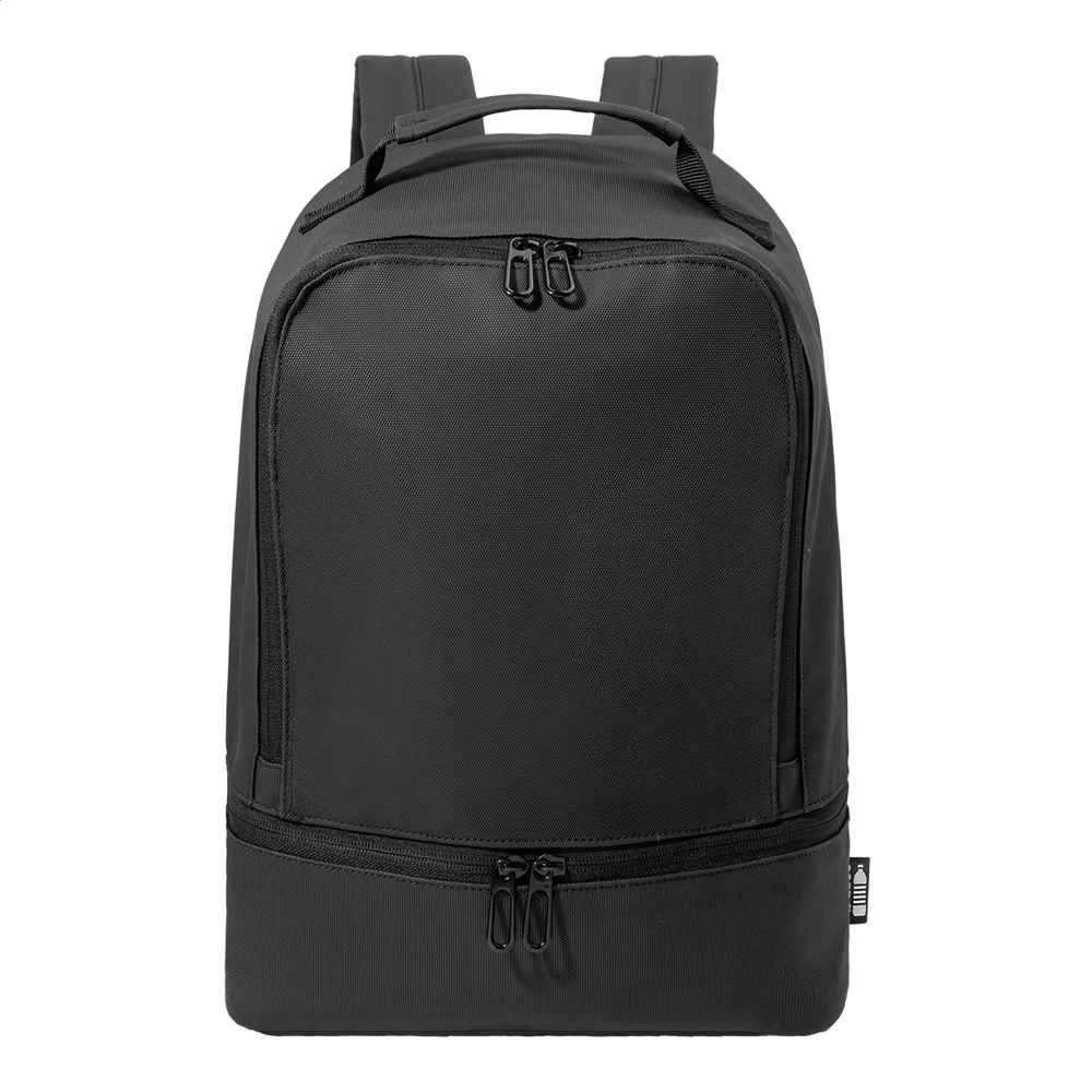 Wasserdichter Rucksack aus RPET mit Reißverschluss-Hauptfach, gepolstertem Laptopfach (bis 13"), Reißverschlussfach am Boden und versteckter Seitentasche. Gepolsterter Rücken und Schultergurte. Material: 600D RPET-Polyester, PU beschichtet. Mit Label RPET.