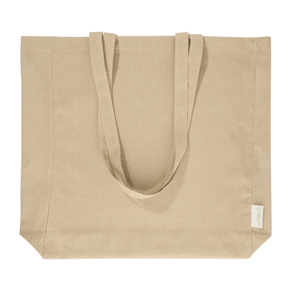 Einkaufstasche mit Seitenfalte und langen Henkeln. Material: 70% recycelte Baumwolle und 30% RPET Polyester, 140 g/m². Mit Label RPET.
