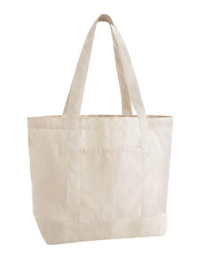 Zertifizierte Bio-Baumwolle | Hochwertiges, schweres Gewebe | Externe Schlupftaschen | Farblich abgesetzter Sockel und Griffe | Selbsttragende Griffe aus Stoff | Kann in der Hand oder über der Schulter getragen werden | CutAway-Etikett für einfaches Rebranding | Lieferung ohne Dekoration/Inhalt