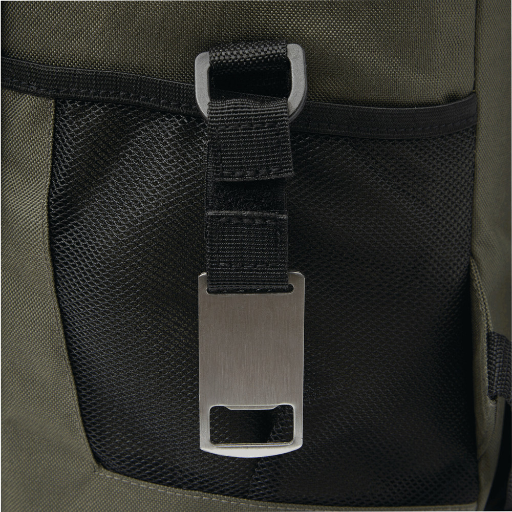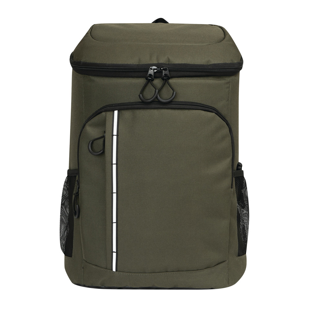 Kühlrucksack YUKON: 1 großes isoliertes Reißverschluss-Hauptfach mit PEVA-Futter, 1 Reißverschluss-Vorfach mit Reißverschluss-Netzfach, 1 vertikales Reißverschluss-Vorfach mit reflektierendem Streifen, 2 seitliche Netzfächer, 1 abnehmbarer Flaschenöffner aus Edelstahl, wasserabweisender Boden, verstellbare gepolsterte Schultergurte, Tragegriff