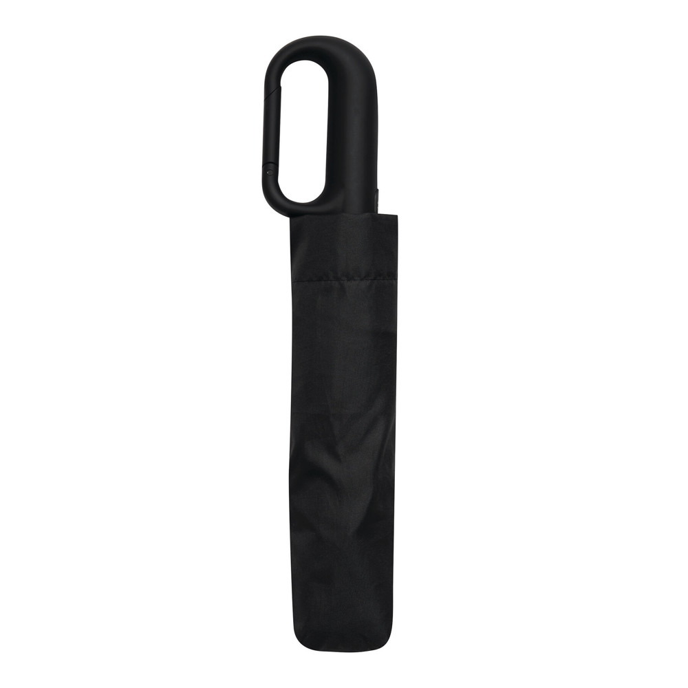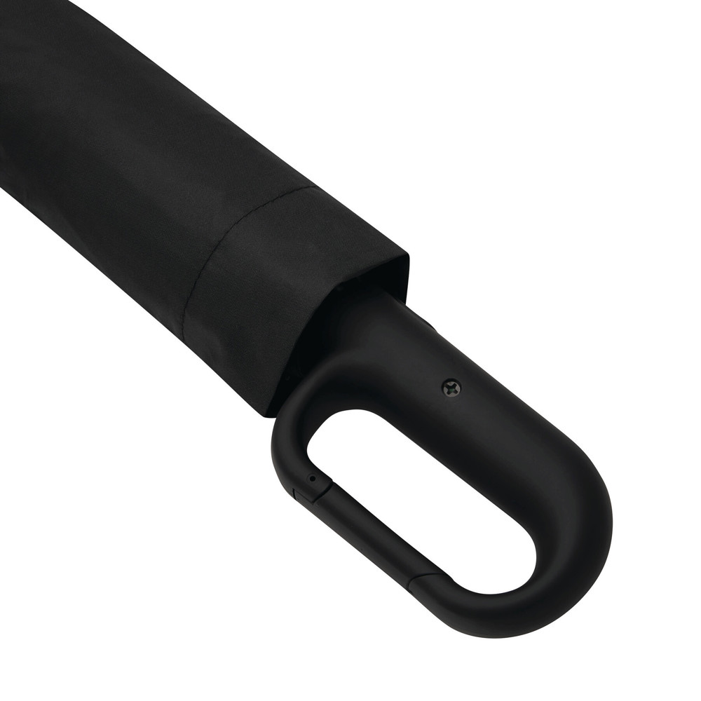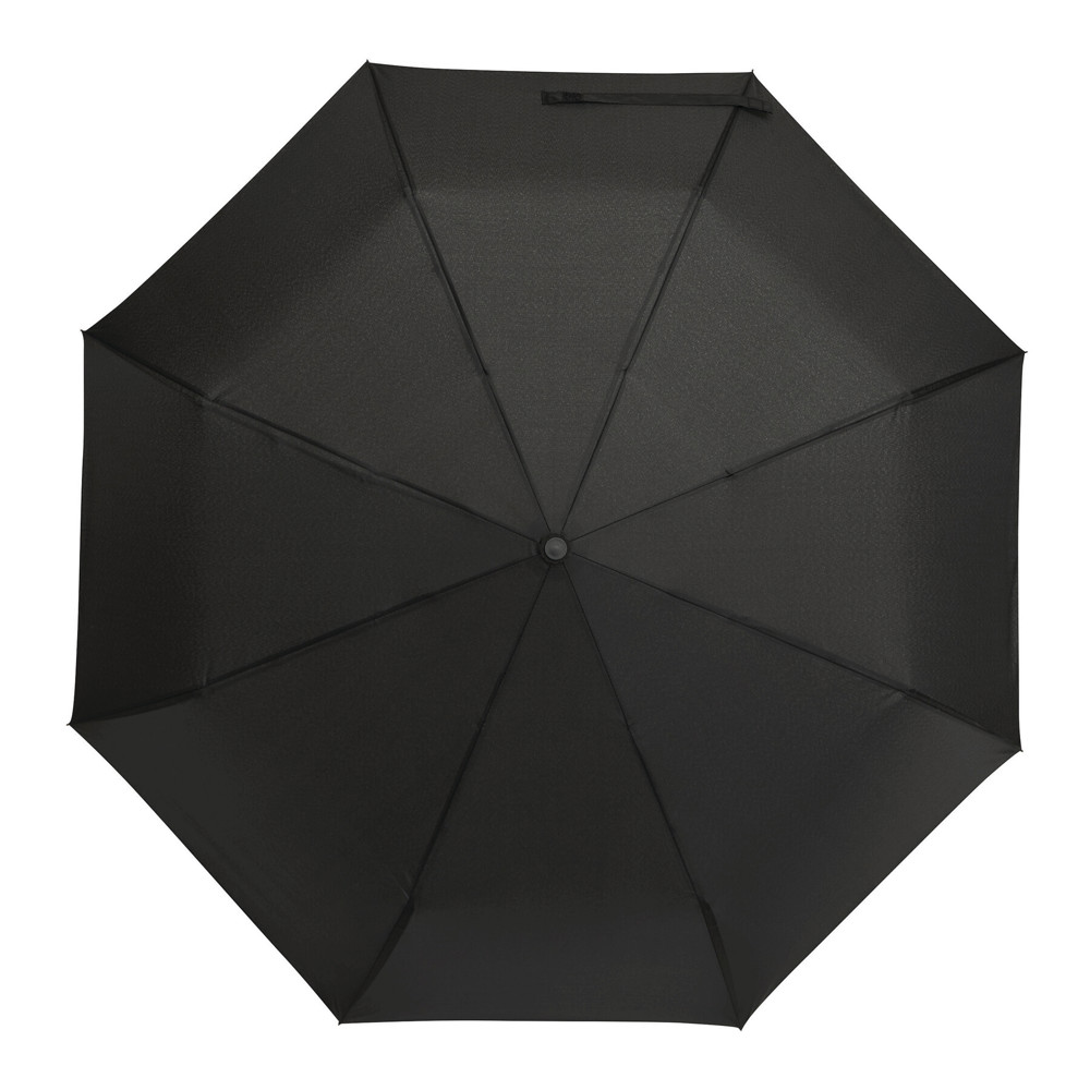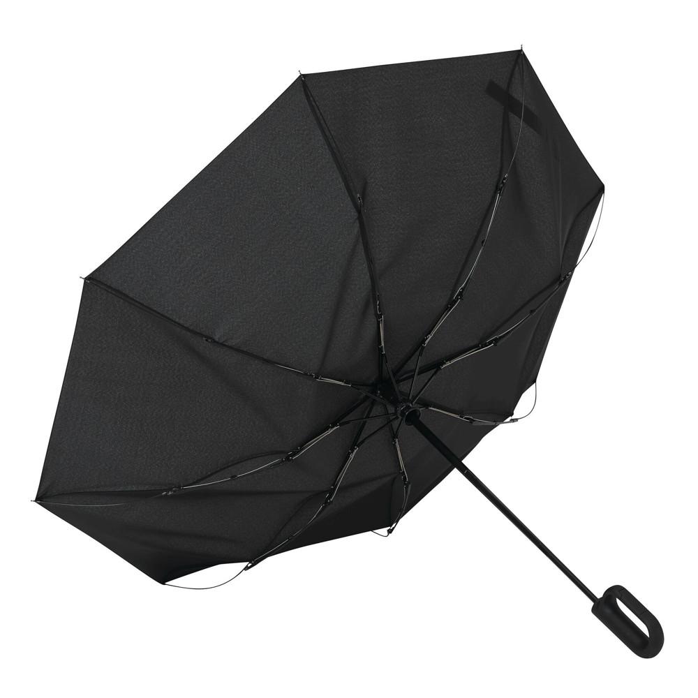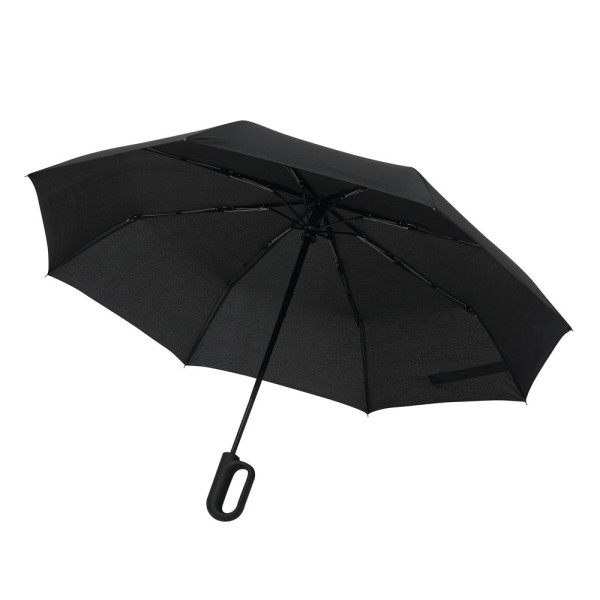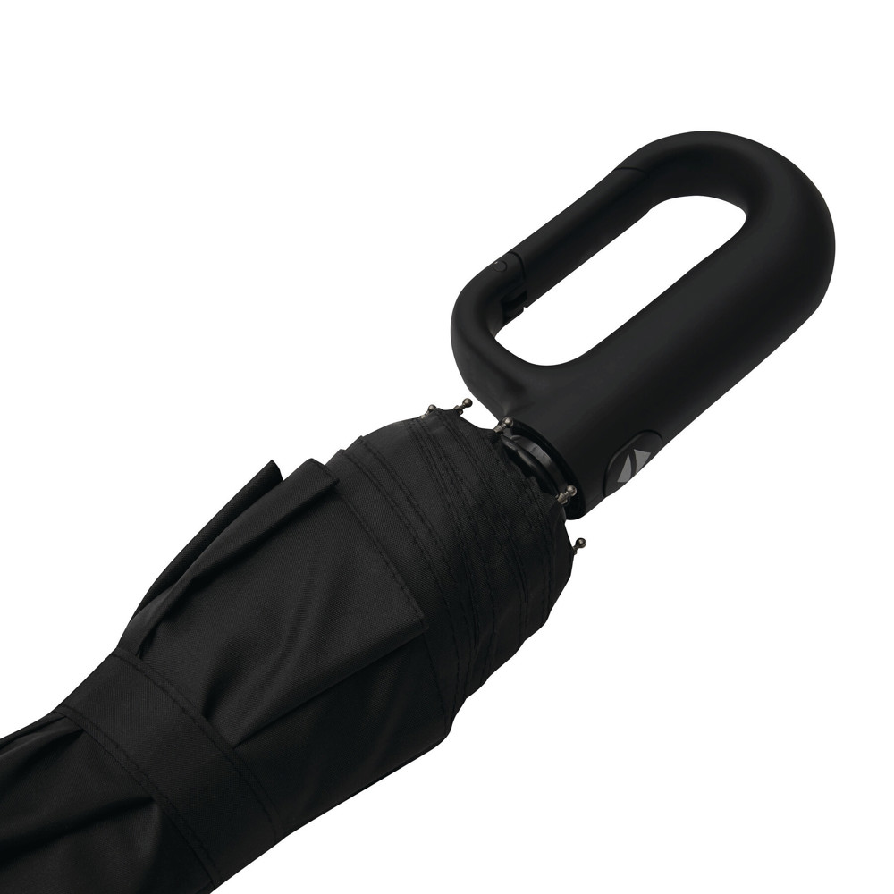 Vollautomatischer Windproof-Taschenschirm SCIROCCO in farblich abgestimmtem Futteral: 3-teiliger Metallstock, mit Metall-Fiberglasspeichen und Metalltips, schwarzer gummierter Karabiner-Kunststoffgriff, Polyester-Pongee-Bespannung aus recycelten Kunststoffen / RPET, Schließband mit Klettverschluss