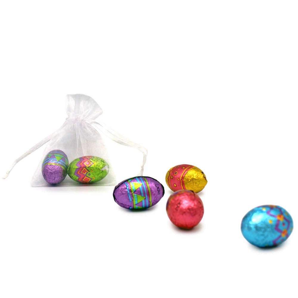 Organzasäckchen "'EIER". Unser Organzasäckchen "EIER" ist ein Volltreffer in Sachen Geschmack! Zwei Vollmich Hohleier sorgen für eine kleine süße Aufmerksamkeit. Eine Werbebotschaft ist mittels Oster-Kärtchen möglich. Dieses kann individuell gestaltet werden. Oder Sie wählen aus den vier Standard-Kärtchen eines aus und lassen Ihr Logo eindrucken.