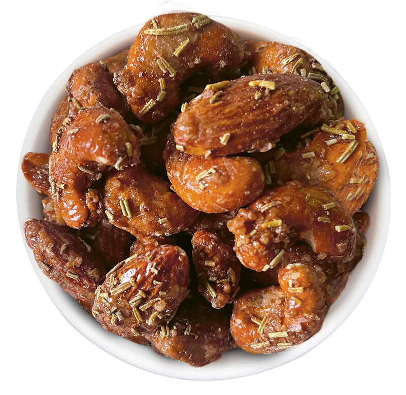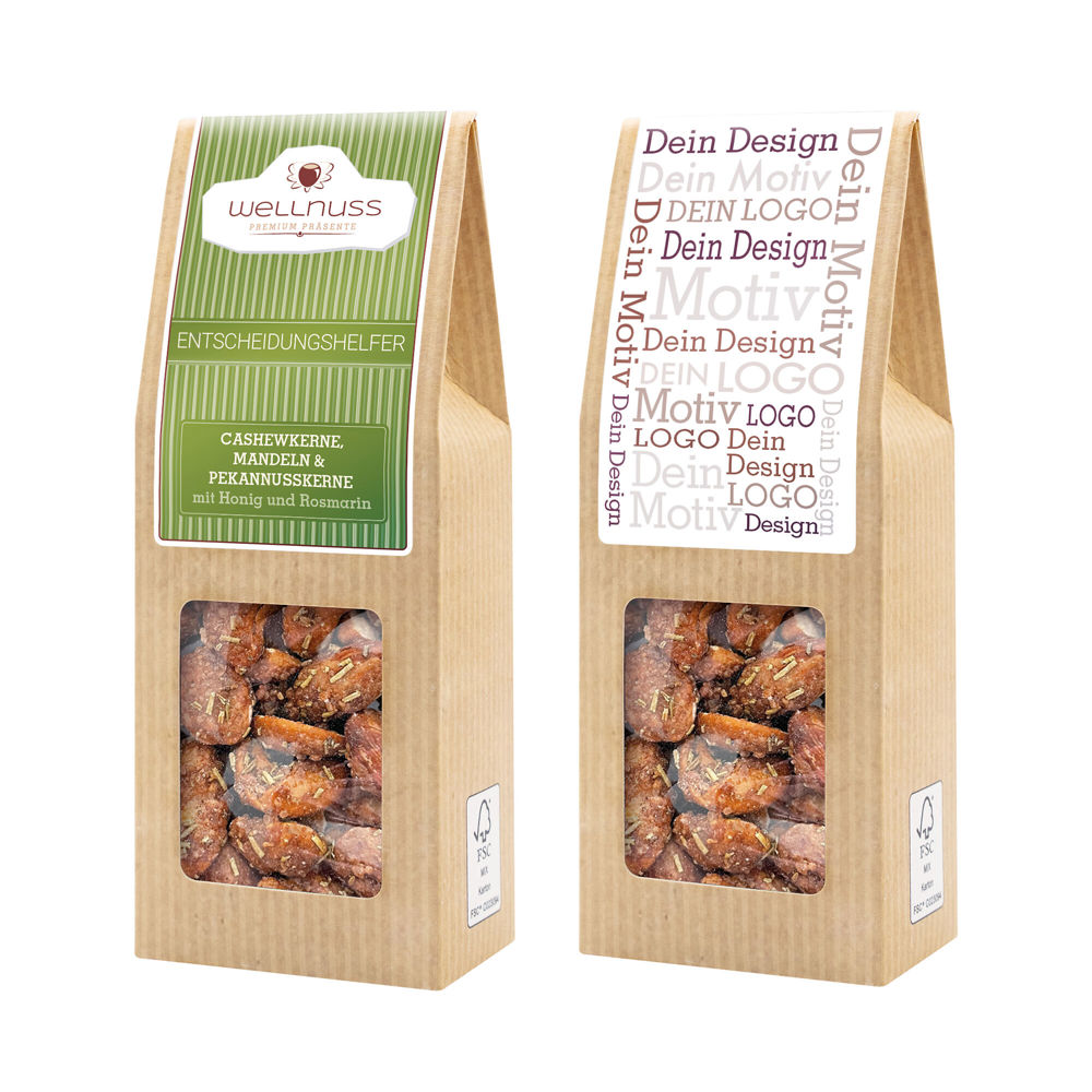 Ab 250 Stück mit Ihrem Motiv im 4c Druck auf dem Etikett der Faltschachtel, ab 2.500 Stück bedrucken wir den Faltschachtelkarton vollflächig: Der aufmerksamkeitsstarke Bestseller. Die Faltschachtel als nachhaltiges Premium-Giveaway. Knackige Mandeln, Cashews und Pekannüsse treffen auf eine feine Karamellschicht aus Honig – süß, knackig und leicht geröstet. Der Rosmarin bringt eine würzige, mediterrane Note dazu und sorgt für einen spannenden Kontrast.
