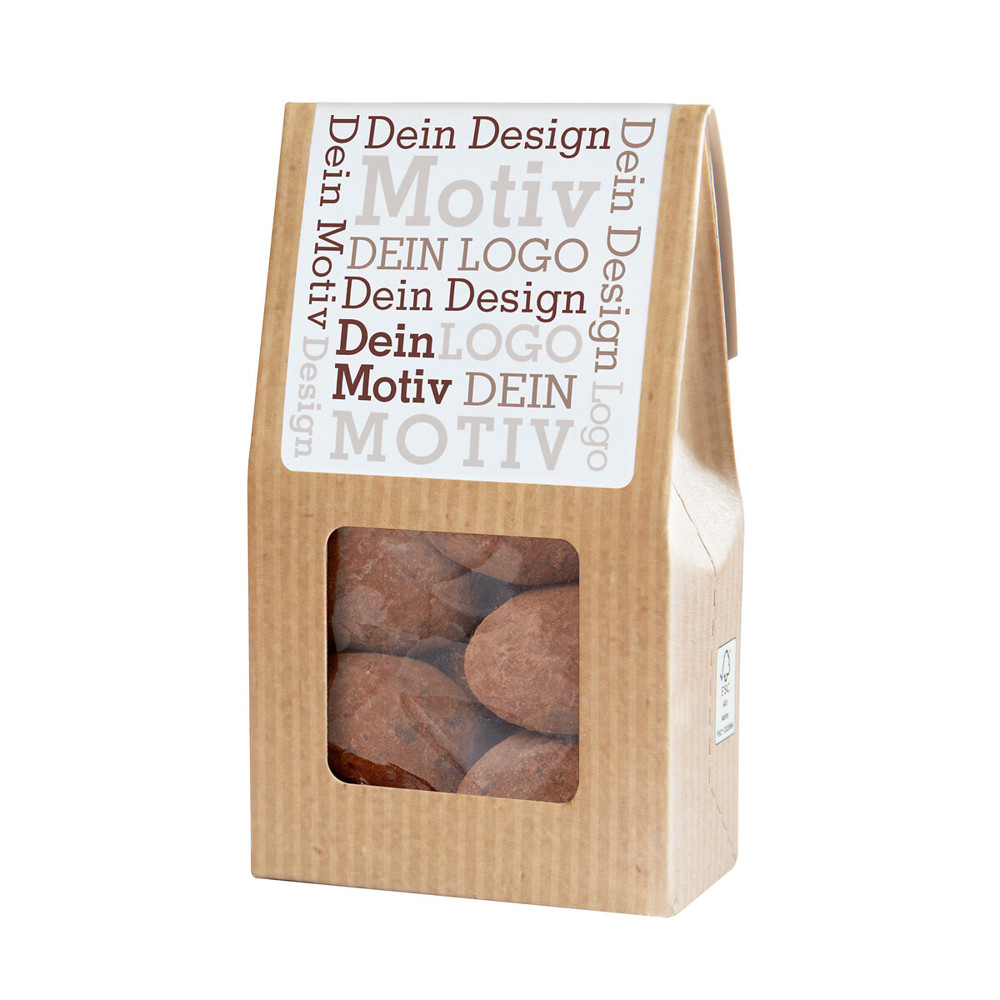 Ab 500 Stück mit Ihrem Motiv im 4c Druck auf dem Etikett der Faltschachtel, ab 2.500 Stück vollflächig bedruckt im Offsetdruck: Unser aufmerksamkeitsstarker Bestseller. Die Mini-Faltschachtel als nachhaltiges Premium-Giveaway. Ein Mandelkern, umhüllt von feinster belgischer Schokolade, bedeckt mit einem Hauch Kakaopulver. Die Kombination aus fein-herben Kakao mit zart-schmelzender Schokolade und einer knackigen Mandeln ist einfach unwiderstehlich. Sie suchen eine andere Größe? Dieses Premium Präsent ist auch als Faltschachtel und Maxi Faltschachtel erhältlich.