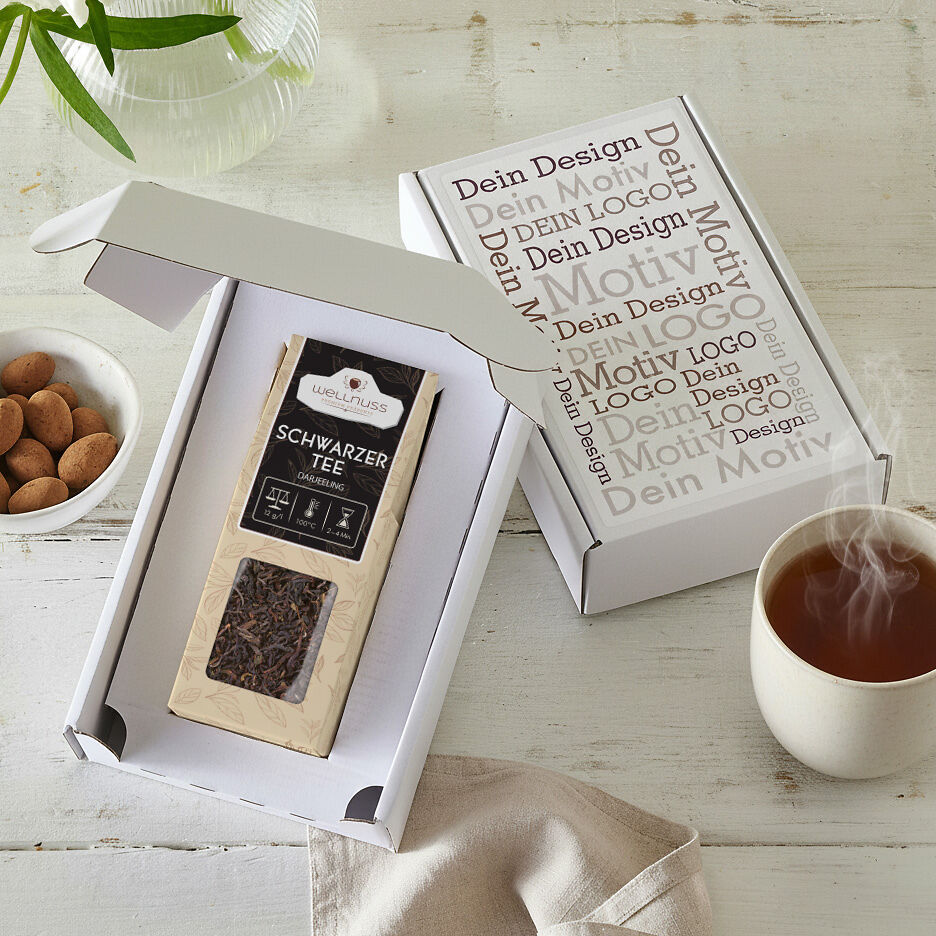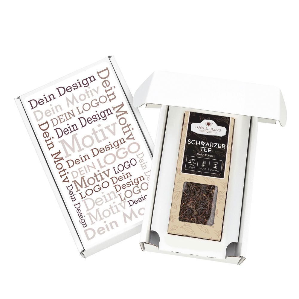Ab 100 Stück mit Ihrem Etikett im 4c Druck auf dem Deckel des schwarzen oder weißen Geschenkkartons, ab 1.000 Stück vollflächig bedruckt im Offsetdruck: Der Geschenkkarton ist portooptimiert und kann ohne Umkarton versendet werden. Wählen Sie aus folgenden Tee Spezialitäten: Schwarzer Tee Darjeeling, Grüner Tee Japan Bancha, Kräutertee Almwiese oder Chai Gewürzmischung Sie suchen eine andere Größe? Dieses Premium Präsent ist auch mit 2, 3 oder 4 Faltschachteln erhältlich.