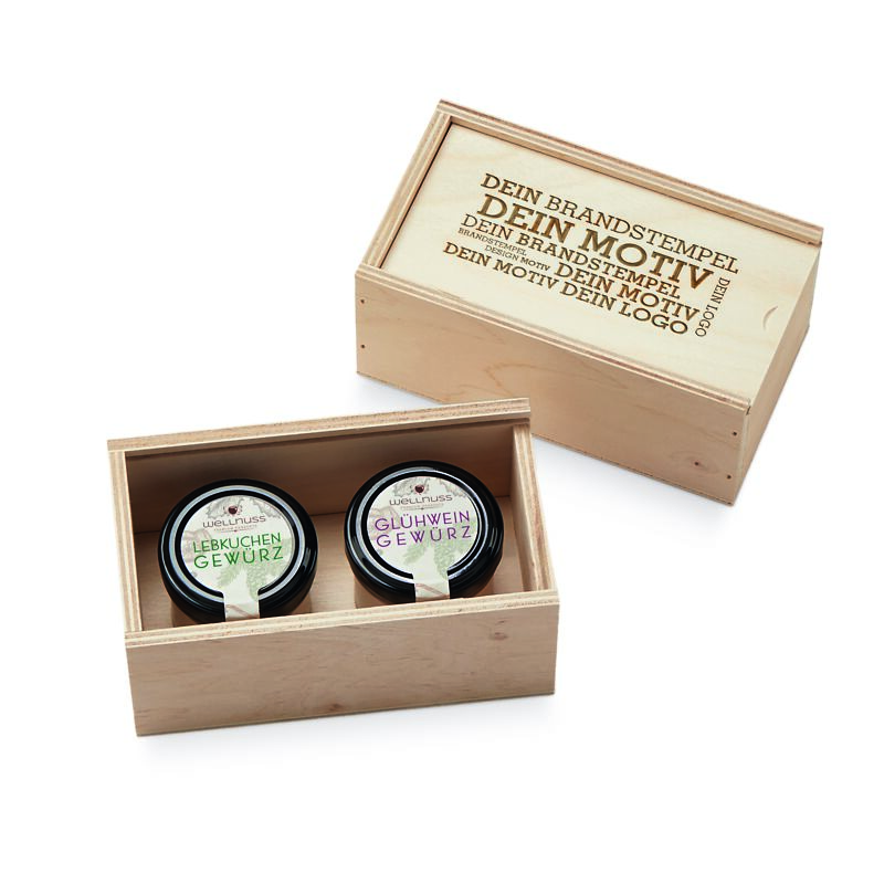 Ab 50 Stück mit Ihrem Branddruck auf dem Deckel der Birkenholzbox: Verschenken Sie Gourmet Gewürze mit Premium Zutaten ohne künstliche Zusatzstoffe, 100 % plastikfrei verpackt und mit Liebe konfektioniert in Deutschland. Verschenken Sie Weihnachts-Spezialitäten mit Premium Zutaten ohne künstliche Zusatzstoffe, 100 % plastikfrei verpackt und mit Liebe konfektioniert in Deutschland. Sie suchen eine andere Größe? Dieses Premium Präsent ist auch mit 3 oder 4 Gläsern erhältlich.