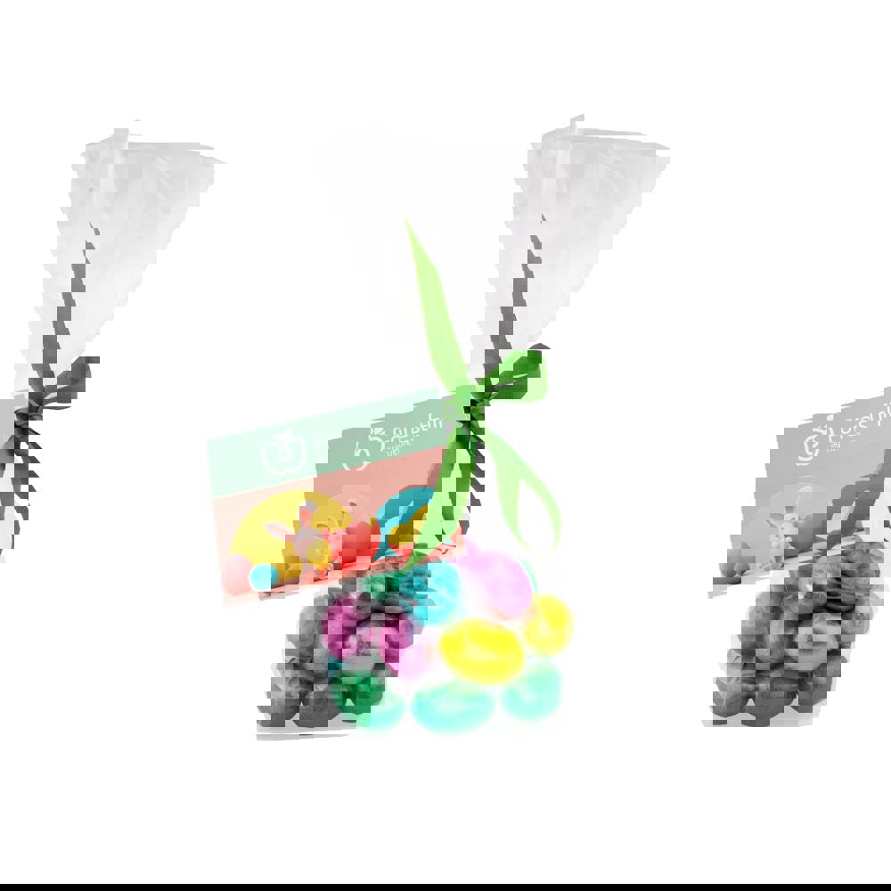 Transparenter Blockbeutel mit 4c-Euroskala bedruckter Karte an einem Schleife, gefüllt mit 133 Gramm cremigen Schokoladen-Ostereiern.