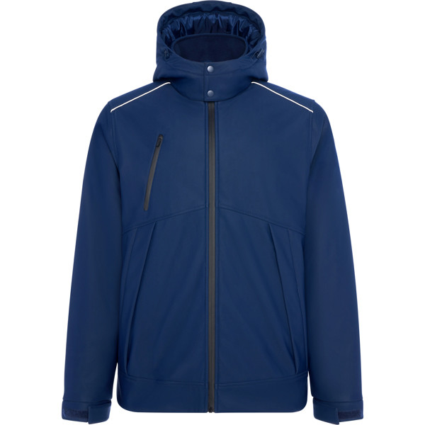Gepolsterter Thermo-Sportparka, zertifiziert für Wärme. Reflektierende Details an Schultern und Rücken. Heißversiegelte Reißverschlüsse auf der rechten Seite und auf der Vorderseite der Brust. Zwei Seitentaschen mit Reißverschlüssen, die von einer Stoffknopfleiste bedeckt sind. Innentasche auf der linken Seite. Ärmel mit Klettverschluss und 1 x 1 gerippten, verstellbaren Bündchen. Zugang auf der Rückseite für die Wiederaufbereitung. Feste Kapuze mit Verstellern. (EN 14058:2017).