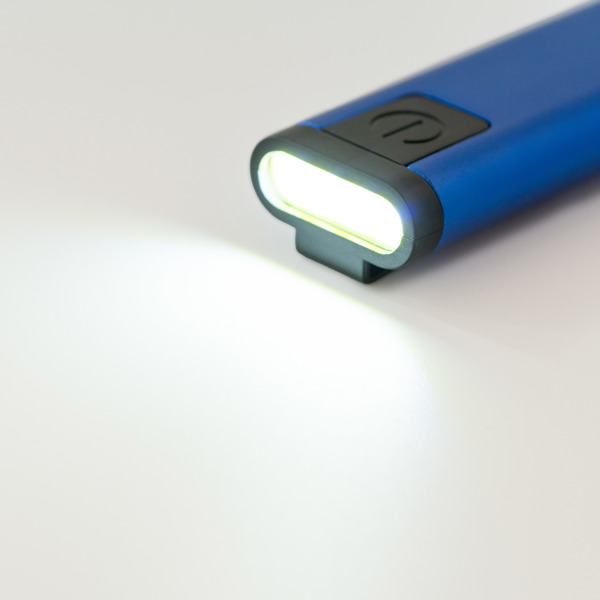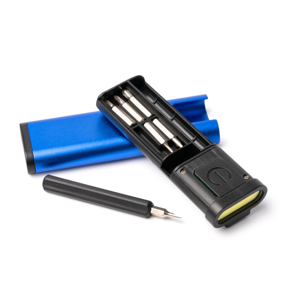 Ultra schlankes Multifunktionswerkzeug mit Taschenlampe aus Aluminium mit ABS-Details. Die Taschenlampe hat eine Leistung von 70 Lumen. Im Inneren befindet sich ein Staufach mit Griff und austauschbaren Bits für die Schraubendreherfunktion. Funktioniert mit mitgelieferten Knopfzellenbatterien.
