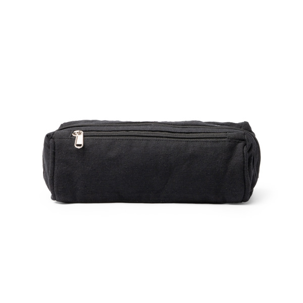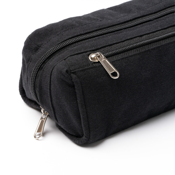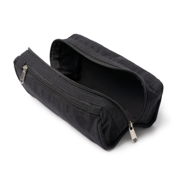 Kulturbeutel aus recycelter Baumwolle (300 g/m²) mit einem Hauptfach und einer Außentasche für kleinere Gegenstände, beide mit Metallgriffen und Reißverschluss.