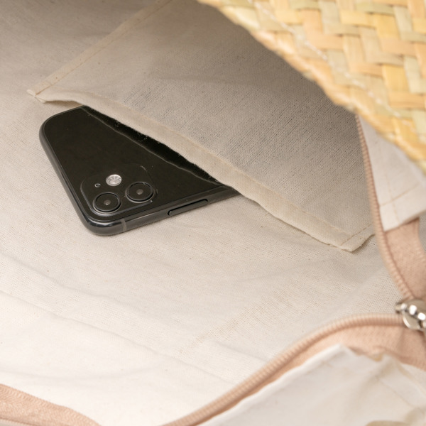 Handtasche mit Strohaußenseite und Innenfutter aus Baumwolle. Verfügt über ein geräumiges Hauptfach mit Reißverschluss und lange PU-Ledergriffe, beide in passender Ausführung. Inklusive einer Innentasche für kleine Gegenstände und einem vorderen Bereich, der sich ideal für das Anbringen eines Markenzeichens eignet.