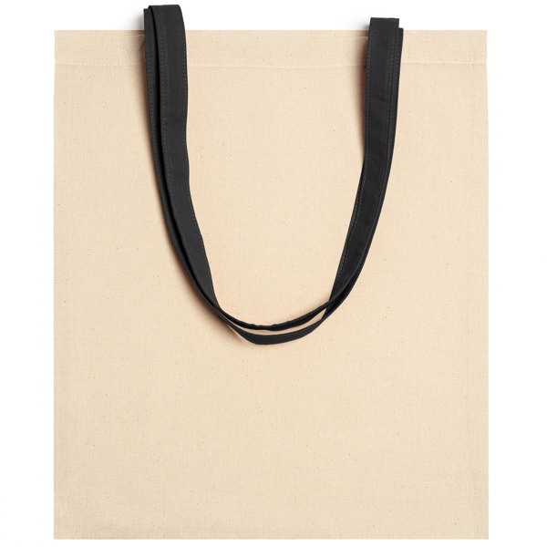 Tasche aus 100 % Baumwolle (140 g/m²) in Naturfarbe mit 70 cm langen farbigen Griffen.