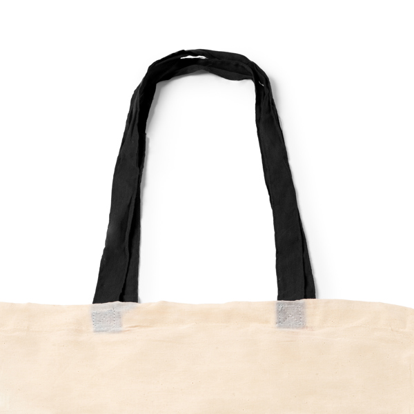 Tasche aus 100 % Baumwolle (140 g/m²) in Naturfarbe mit 70 cm langen farbigen Griffen.