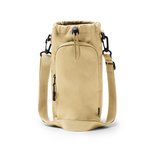 Flaschentasche zum Umhängen für Flaschen bis zu 2,5 l, hergestellt aus RPET 600D mit einem verstellbaren Kordelzugverschluss. Mit einer großen Außentasche mit breiter Öffnung und einem Reißverschluss in einer zum Körper passenden Farbe, mit einem schwarzen Reißverschlusszug. Sie verfügt über einen verstellbaren Gurt mit Verstärkungen für den Transport, der dank des eingebauten Karabiners abgenommen werden kann. Der Innenraum ist gefüttert, was ihn widerstandsfähiger und langlebiger macht.