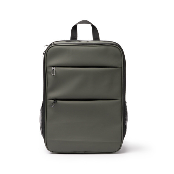 Rucksack aus PU-Leder mit zwei Fächern, beide mit doppeltem Reißverschluss. Einer von ihnen ist gepolstert und speziell für Laptops bis zu einer Größe von 15 Zoll konzipiert. Das andere, durch einen Reißverschluss verlängerbare Fach verfügt über eine Tasche mit elastischer Einstellung, die speziell für die Beförderung anderer Geräte konzipiert wurde. Verfügt über zwei Vordertaschen mit Reißverschlüssen. Er besitzt zwei Seitentaschen aus Netzgewebe mit elastischer Einstellung für Flaschen oder Trinkflaschen. Dank seiner Funktionen und seiner gepolsterten Griffe und Rücken ist es eine bequeme und vielseitige Option, um Ihre Habseligkeiten überallhin mitzunehmen.