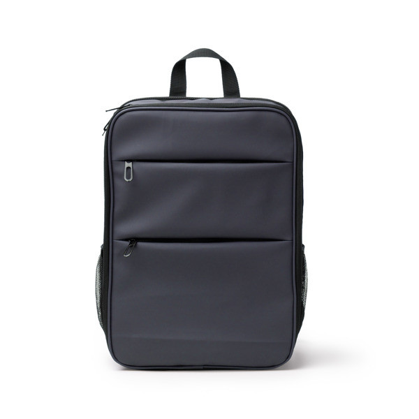 Rucksack aus PU-Leder mit zwei Fächern, beide mit doppeltem Reißverschluss. Einer von ihnen ist gepolstert und speziell für Laptops bis zu einer Größe von 15 Zoll konzipiert. Das andere, durch einen Reißverschluss verlängerbare Fach verfügt über eine Tasche mit elastischer Einstellung, die speziell für die Beförderung anderer Geräte konzipiert wurde. Verfügt über zwei Vordertaschen mit Reißverschlüssen. Er besitzt zwei Seitentaschen aus Netzgewebe mit elastischer Einstellung für Flaschen oder Trinkflaschen. Dank seiner Funktionen und seiner gepolsterten Griffe und Rücken ist es eine bequeme und vielseitige Option, um Ihre Habseligkeiten überallhin mitzunehmen.